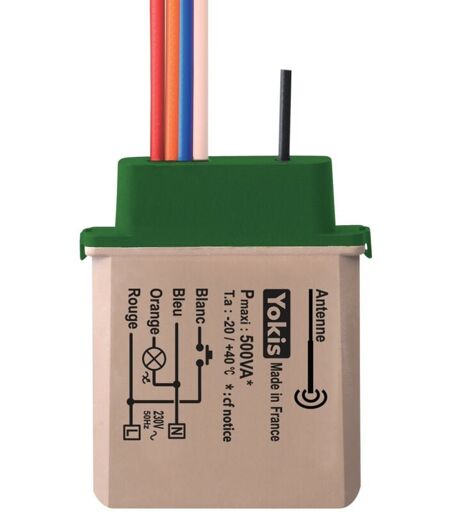 DESCRIPTION GÉNÉRALE Le télévariateur radio encastrable Yokis MTV500ERP 500W permet de régler les éclairages depuis plusieurs points de commande ou une télécommande. Il est idéal pour les chambres et les pièces à vivre, permettant de varier l'intensité lumineuse selon les besoins. Il dispose d'une fonction de temporisation pour éteindre la lumière automatiquement et d'un mode veilleuse pour enfant. SPÉCIFICATIONS TECHNIQUES Tension secteur : 230 V ~ (+ 10 % - 15 %) - 50 HZ Puissance : minimum 3 W - 500 W ou 5 W - 500 W / 11 VA - 250 VA Intensité maximale : 2 A / 1 A Boite étanche : 1,3 A / 300 VA Autres boites : 2,2 A / 500 VA Température ambiante : - 20 °C à + 40 °C Humidité relative : 0 à 90 % Immunité aux parasites secteurs : jusqu'à 1,5 KV Portée : 250 m en champ libre à vue et sans obstacle Fréquence : 2,4 GHz Transmission : bidirectionnelle avec LED de contrôle sur l'émetteur COMPATIBILITÉ ET ACCESSOIRES Compatible avec toutes les charges allant de 0 à 500W Fonctionne avec ...