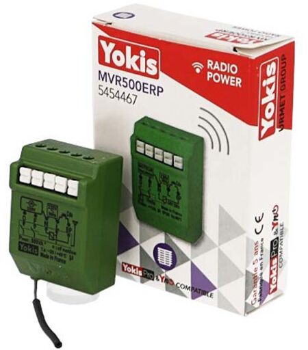 Contrôle volet roulant. Programmation journalière intégrée. Commande sans fil 250 mètres. Faites votre choix de YOKIS dans notre offre de Énergie verte & durable Materiel electrique chez bis-electric sur bis-electric, votre fournisseur de matériel électrique sur internet. Nous vous proposons un catalogue d'appareillage électrique pour l'électricité bâtiment et l'électricité industrielle pour vous aider dans la réalisation de vos installations électriques neuves ou en rénovation. Faites le bon choix parmi notre gamme de Économie energie maison > Solution Domotique > Micromodule domotique Maison domotique Courant Faible chez bis-electric - Micromodule POWER - portée 250m MVR500ERP Micromodule volet roulat Yokis sans fil Micromodule radio volet roulant Yokis Caractéristiques techniques : Référence : Yokis MVR500ERP 5454467Tension d'emploi : ~230VPuissance moteur : 230V à 3 filsDimension HxLxl : 42 mm x 28 mm x 18 mmNiveau sonore : 60 dBIndice de protection: IP50 Raccordement : Ce micromodule radio Yokis volet roulant 500W conçu par le fabricant français se branche au moteur du volet roulant en utilisant les borniers enclipsable. Il est possible de connecter le module MVR500ERP Yokis pour volet roulant via fréquence radio avec un émetteur ou une télécommande, il suffit simplement de cliquer sur la touche de la télécommande et d'appuyer sur le bouton > présent sur le micromodule. Il s'adapte avec les volets roulant à moteur 3 fils et 4 fils. Description : Le MVR500ERP pour volet roulant conçu par l'entreprise française Yokis permet de rendre un bâtiment ou un logement plus ergonomique, grâce à ses fonctionnalités avancées et sa commande sans fil possible, sa portée de transmission est de 250 mètres. Ce micromodule Yokis MVR500ER P permet de contrôler le fonctionnement d'un volet roulant. Le Yokis volet roulant sans fil gère les montées et descentes avec soit un interrupteur poussoir raccordé à un émetteur soit avec une télécommande de la marque Yokis. Il est possible d'interconnecter plusieurs micromodules Yokis volet roulant ensemble afin de centraliser la commande, et de contrôler le fonctionnement de plusieurs volets roulant en même temps, il faut simplement les lier. Un MVR500ER P ne peut gérer le fonctionnement que d'un seul volet roulant. Le Yokis MVR500E RP possède un contrôle de force pour éviter la détérioration ou la cassure du volet roulant ou de son moteur. Un programmateur est également intégré dans le MVR500E RP pour permettre de créer un scénario d'ouverture et fermeture journalière (trois positions sont possibles : position ouverte, position fermée et position intermédiaire), possibilité de multizone et de commande déportée. L'utilisation du Yokis volet roulant radio convient parfaitement pour être installé dans un bâtiment ou dans un habitat aussi bien neuf qu'ancien. Chaque micromodule Yokis MVR500 ERP est encastrable ce qui évite qu'il soit visible et qu'il ne dérange à la décoration intérieure. Tous les micromodules créés par... ...