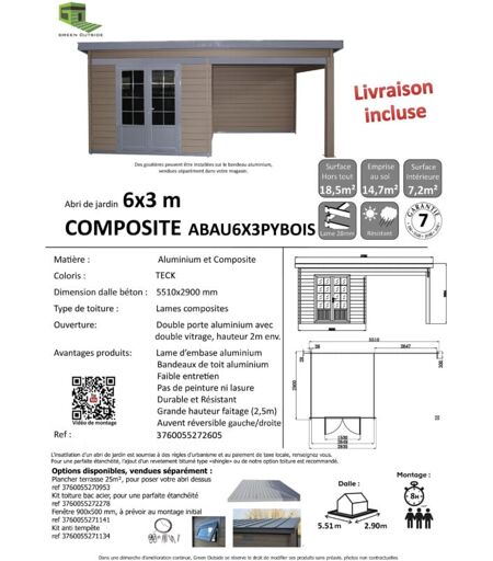 Description générale Découvrez notre abri de jardin - Pool House en Aluminium et Composite de 18,5 m² avec toit plat. Conçu avec la technologie Coexprotect®, cet abri allie modernité et durabilité, tout en s'intégrant parfaitement dans votre espace extérieur grâce à son coloris aspect bois. Idéal pour la détente, le rangement ou comme pièce à vivre, cet abri est sans entretien et résistant aux intempéries. Spécifications techniques Surface hors tout : 6050 x 3050 mm (18,5 m²) Surface au sol : 5510 x 2900 mm (16 m²) Surface intérieure : 2718 x 2649 mm (7,2 m²) Hauteur faitage : 2524 mm Poids : 1200 kg Coloris : Teck Compatibilité et accessoires Kit toiture en bac acier fourni (12 plaques 3200 x 500 mm) Kit anti-tempête recommandé, incluant câble, serre-câble, tendeur et vis d'ancrage Installation La pose est recommandée sur une dalle en béton ou sur un plancher terrasse composite (option vendue séparément). Consultez la vidéo d'installation disponible sur notre chaîne YouTube pour des ...
