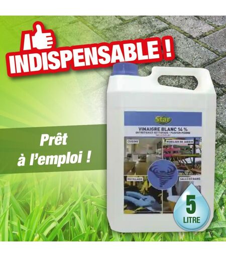 Description générale Le vinaigre blanc 14° est un produit prêt à l'emploi, idéal pour l'entretien et le nettoyage des jardins, cuisines, salles de bain et mobiliers de jardin. C'est un désherbant naturel, bactéricide et fongicide, qui élimine efficacement les salissures. Spécifications techniques Type : Vinaigre blanc 14° Conditionnement : Bidon de 5 litres Composition : 100% vinaigre avec 14° d'acidité Compatibilité et accessoires Utilisable en agriculture biologique Compatible avec tous types de surfaces à nettoyer Installation Aucune installation requise. Prêt à l'emploi. Utilisation Pour désherber : vaporiser sur les jeunes pousses de mauvaises herbes. Pour détartrer : utiliser pur sur les surfaces à traiter, ou diluer selon les besoins (ex: 40 mL pour 1 L d'eau). Pour nettoyer : diluer dans de l'eau tiède (1 verre de vinaigre pour 1 L d'eau) pour les vitres et réfrigérateurs. Pour désinfecter les outils : diluer 28 mL de vinaigre dans 1 L d'eau. Autres informations Pour un usage ...