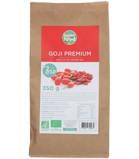 Veillez à avoir une alimentation variée et équilibrée et un mode de vie sain.Exopharm Goji Premium Bio350 g sont des baies de Goji séchées.Utilisées depuis des milliers d'années dans l'alimentation au Tibet ou en Chine, les baies de Goji sont reconnues comme aliment fonctionnel de premier choix pour le bien-être du corps.Elles se consomment en l'état ou mélangées à un yaourt, des céréales, dans les pâtisseries, des plats cuisinés ou des soupes.Certifié Agriculture Biologique. Contrôle FR-BIO-10.IngrédientsBaies de Goji séchées* (Lycium barbarum).*Ingrédient issu de l'Agriculture Biologique.Valeurs nutritionnellesValeurs nutritionnellesPour 100 gValeur énergétique333 kcal / 1390 kJGlucides59,8 gDont sucres48,9 gLipides2,7 gDont acides gras saturés0,3 gProtéines11,3 gFibres11,9 gSel0,92 gConseils d'utilisationConsommer 20 à 30 g par jour (une bonne poignée au creux de la main).Précautions d'emploiAprès ouverture, conserver dans un endroit frais et sec.Poids net350 gAdresse du FabricantLaboratoire EXOPHARM SAS5 rue du Neuland67560 ROSHEIM ...