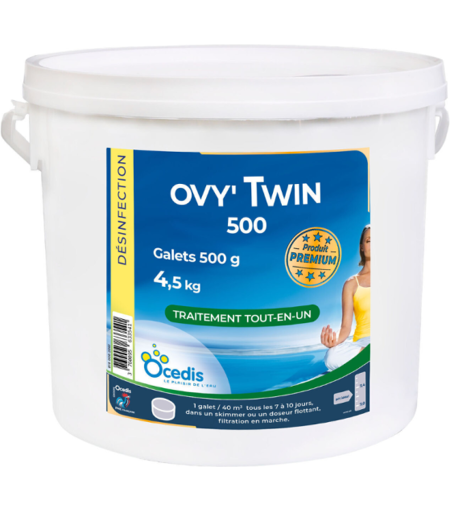 2 en 1, désinfection choc et régulière avec OVY' Twin 500 Bloc de chlore Force 5 pour une désinfection régulière prolongée Enrichi à l'oxygène actif pour un traitement choc hebdomadaire Limite l'élévation du taux de stabilisant à proportion de la répartition chlore/oxygène actif Elimine les algues Améliore la filtration Eclaircit l'eau Les avantages de l'OVY' Twin 500 Tout en un : 1 seul produit pour l'entretien de la piscine Désinfection choc et longue durée grâce à la synergie des deux produits Réduit l'apport en stabilisant Élimine les algues Améliore la filtration Éclaircit l'eau Mode d'emploi Piscine familiale : Placer OVYTWIN 500 dans un skimmer ou un doseur flottant Dosage : Un galet d' OVYTWIN 500 par tranche de 40 m3 d'eau, tous les 7 à 10 jours. Sécurité Utilisez les produits biocides avec précaution. Avant toute utilisation, lisez l'étiquette et les informations concernant le produit. Dangereux. Respecter les précautions d'emploi. Avant toute utilisation, assurez-vous que celle-ci est indispensable, notamment dans les lieux fréquentés par le grand public. Privilégiez chaque fois que possible les méthodes alternatives et les produits présentant le risque le plus faible pour la santé humaine et animale et pour l'environnement. TP2. ...