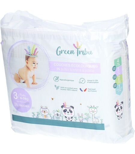 Nous souhaitons toujours ce qu’il y a de mieux pour nos enfants. Afin de répondre à cette attente, Green Tribu a élaboré les Couches Écologiques. Disponibles en 4 tailles différentes, elles sont parfaitement adaptées à l’anatomie de votre enfant quel que soit sa taille et/ou son âge. Son action anti-fuites garantit jusqu’à 12h d’absorption et offre à bébé un confort sans pareil dans son lange. Testées sous contrôle dermatologique, ces couches ne disposent d’aucun des 26 allergènes listés par l’Union Européenne et entrent donc parfaitement dans les normes. Ces couches hypoallergéniques ont étéfabriquées en France. De plus, ne contenant ni chlore, parfum, lotion, pesticides, glyphosate, AMPA et latex, elles respectent la peau de bébé et lui évite toutes sortes d’allergies ou d’irritations de la peau.ApplicationÉcarter les barrières latérales avant de changer bébé.Aucune couche écologique jetable n'est 100% biodégradable. Ne pas jeter la couche dans la nature ni dans les toilettes.IngrédientsVoile de surface : non tissé* Green PE (canne à sucre)/PLA (fécule de maïs, betterave, pomme de terre). Barrières intérieures antifuite : non tissées* Bio PE (canne à sucre) /PP. Coussin anatomique : 100% cellulose naturelle certifiée FSC* et TCF (blanchie sans chlore). Cœur ultra-absorbant : polyacrylate de sodium. Voiles d'acquisition, extérieur et de maintien, système de fixation : non tissé polyéthylène, polyester, polypropylène, polyamide. Fronces protectrices à l'entrejambe : élasthanne sans latex. Colle.*en contact avec la peau de bébé. ...