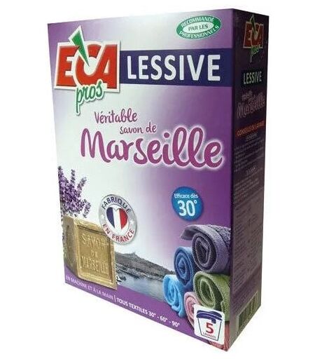 Lessive en poudre au savon de marseille, 670g ECA PROS référence 171348 Lessive en poudre au savon de Marseille. Formule sans phosphate. Utilisable pour lavage à la main ou en machine. Efficace à toute température. Efficace sur tous les textiles. Idéale pour les peaux sensibles. Permet 5 lavages. Fabrication française. Dangereux. Respecter les précautions d'emploi. ...