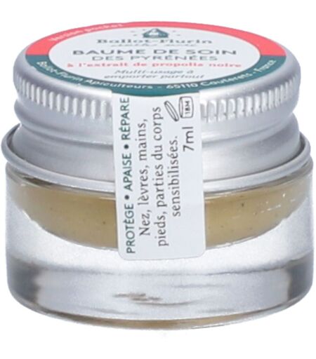 PROTÉGER ET RÉPARER VOTRE PEAU Le Baume de Soin des Pyrénées calme les irritations et protège (nez et lèvres), répare les zones exposées (gerçures et crevasses), efficace sur mains sèches et abîmées, apaise les échauffements et assainit les pieds. Il s’applique en massage sur les zones courbaturées. Disponible en version pocket de 7 ml à emporter partout.Multi-fonctions été comme hiver Peau, nez lèvres : protège et apaise les irritations Gerçures et crevasses : répare les zones exposées (lèvres, mains...). Assainit les pieds et apaise les échauffement. S'applique en massage sur les parties du corps sensibilisées et courbaturées FORMULE DE NOS MONTAGNES 100% d'ingrédients naturels dont 98,75% bio Extrait de propolis noire française dynamisée, certifiée 100% bio, issue de nos ruchers et de micro-terroirs locaux préservés Propolis récoltée sur place avec des procédés d’extraction doux et non polluants Préparation garantie sans aucun additif de synthèse ni conservateur. Aucun test sur animaux Senteur naturelle “poudrée” très agréable Inspiré d'une ancienne recette de berger, ce baume de soin à la propolis de nos montagnes est un soin tout terrain : il apaise, répare, assainit et soulage— Catherine FlurinApplicationAppliquer localement en petite quantité et renouveler si besoin.IngredientsSESAMUM INDICUM SEED OIL*, CERA ALBA*, GLYCERIN*, ALCOHOL*, LAVANDULA LATIFOLIA HERB OIL*, LINALOOL, MIMOSA TENUIFLORA BARK EXTRACT, PROPOLIS CERA*, MYROXYLON BALSAMUM PEREIRAE BALSAM EXTRACT, TOCOPHEROL, BISABOLOL*, BENZYL BENZOATE, BENZYL CINNAMATE, LIMONENE, CITRONELLOL, COUMARIN, GERANIOL, BENZYL ALCOHOL, EUGENOL.*Ingrédients issus de l'agriculture biologique. ...