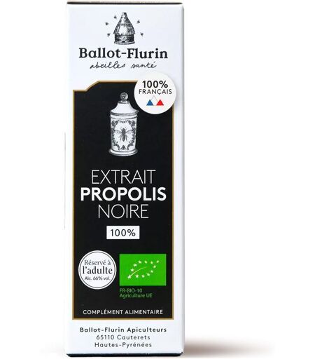 Complément alimentaire à utiliser dans le cadre d’une alimentation variée, équilibrée et d’un mode de vie sain.Ballot-Flurin Extrait Propolis Noire est un complément alimentaire bio, très concentré, fabriqué à partir de propolis noire française issue de l'Apiculture DOUCE®. Ce produit est conçu pour renforcer les défenses immunitaires grâce à sa teneur élevée en propolis brute.Ingrédients100% extrait alcoolique de propolis noire* (eau de vie*, propolis brute des terroirs locaux [23,87% de mise en œuvre]).*Ingrédients issus de l'agriculture biologique. Certifié par FR-BIO-10.Alcool 66% vol.Valeurs nutritionnelles Composant Pour 100g Énergie 228 kJ - 54 kcal Matières grasses 0 g Glucides 13 g dont sucres 0 g Protéines 0 g Sel 0,2 g Conseils d'utilisationPrenez 1 à 2 gouttes par jour, le matin ou le soir, pendant 21 jours. Peut être consommé pur, mélangé avec une cuillère de miel ou dilué dans un peu d'eau. Pour un effet optimal, laissez sous la langue avant d’avaler.Précautions d'emploiConserver dans un endroit frais et sec. Tenir hors de portée des enfants. Ne pas dépasser la dose journalière recommandée. Déconseillé aux femmes enceintes et aux enfants. Contient de l'alcool.Poids net15 mlAdresse du FabricantBioholistic Diffusion SprlAvenue Thomas Edison 1521402 NivellesBelgique ...