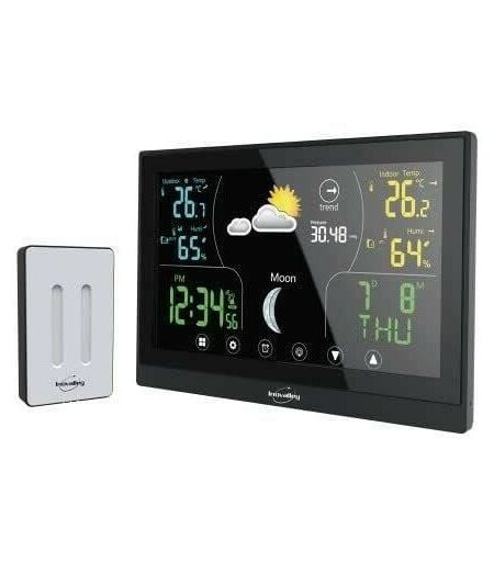 Prévision météo par icones Touches tactiles Radio-pilotée (Signal DCF) Fréquence de transmission RF : 433MHz Ecran couleur rétroéclairé Température et hygrométrie intérieure et extérieure avec mini/maxi Température °C/°F ...