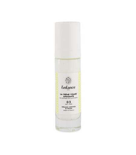 a Crème Visage Apaisante 0-3 ans, "sa première crème", à la formule spécialement composée par Enfance Paris, est gorgée d'un complexe d'ingrédients actifs rares, riches, doux et nourrissants pour la peau délicate du visage des tous petits. La crème Visage Apaisante tient sa promesse et protège et apporte réconfort à la peau sensible du visage des enfants et ce, dès la naissance. Sans parfum de synthèse pour privilégier l'odeur naturelle de la peau et des ingrédients botaniques qui la compose, elle laisse un léger parfum floral sur la peau. Sa texture riche et onctueuse pénètre facilement par un massage doux du visage elle laisse la peau douce et protégée. La Crème Visage Apaisante nourrit en profondeur les peaux les plus desséchées et apaise les sensations d'inconfort et de tiraillement. Formulée avec les justes ingrédients précieux et biologiques sa composition haute tolérance et active à la fois repose sur une association de kokum, un beurre ultra nourrissant riche en acides gras saturés végétaux, d'huile d'amande douce pour ses propriétés adoucissantes et assouplissantes qui améliore de l'élasticité de la peau, d'extrait de fleur de mauve apaisant et adoucissant, qui calme les démangeaisons et lutte contre le dessèchement de la peau, d'huile de noyau d'abricot riche en oméga 9, vitamine A, E et sels minéraux, émolliente et assouplissante, d'eau florale de bleuet, décongestionnante, qui soulage les irritations et purifie la peau, et pour finir de camomille sauvage anti-inflammatoire qui apaise les peaux sensibles sujettes aux rougeurs. Adaptés aux agressions extérieures, elle nourrit, apaise, et protège la peau délicate des enfants en toute sécurité. Testé dermatologiquement sur peau sensible. ...