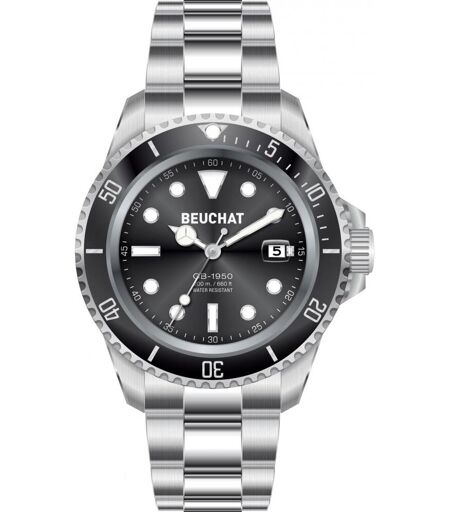 3Suisses : Cette Montre Mixte Beuchat Beu1950-1 - Bracelet Acier Argent est une montre de plongée efficace et étanche jusqu'à 200 m de profondeur. Elle est pratique puisque ses aiguilles ainsi que son index sont luminescents et sa lunette est unidirectionnelle. Cette montre sport est aussi un accessoire de mode mixte très tendance. Type: Montre Marque: Beuchat Genre: Homme Styles: Mode Age: Adulte Couleur du bracelet: Argent Mouvement: Quartz Fonctionnalités: Dateur Matière Bracelet: Acier Garantie: 2 Ans Type de garantie: Fabricant Affichage: Analogique Etanchéité: 200 m (20 ATM) Matière Boitier: Acier Forme de Boitier: Rond Couleur du cadran: Noir Type Fermeture: Boucle déployante Diamètre Boitier: 40 mm ...