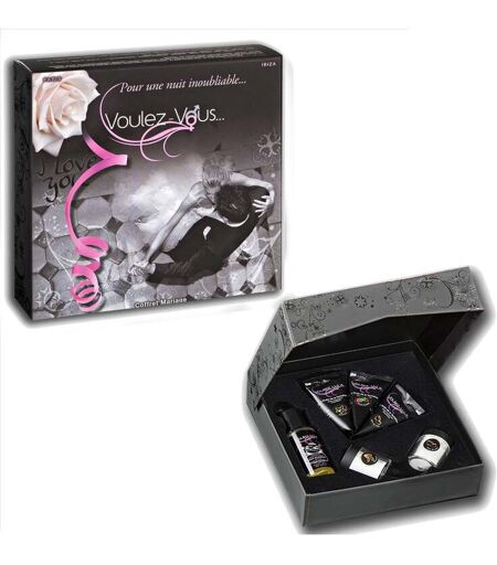 Ce Coffret de Massage Mariage signé Voulez-Vous... inclus 6 produits de massage pour une nuit de noces sensuelle ! C'est le coffret cadeau idéal pour jouer avec vos sens et ceux de votre partenaire. Cette boîte contient l'essentiel pour atteindre les hauteurs de l'érotisme ! La marque Voulez-Vous... propose 13 parfums très originaux. Le Coffret de Massage Mariage contient : * 3 Berlingots d'huiles corporelles chauffantes "Huile de la tentation", ces berlingots (10 ml) se dégustent tendrement sur le corps de votre partenaire. Si vous soufflez délicatement dessus, une douce sensation de chaleur va s'emparer des zones effleurées. Parfums : Vanille, Pina Colada et Fraise Pétillante. * 2 Poudres gourmandes "Chute de neige", ces poudres (4 g) sont à saupoudrer délicatement sur le corps de votre partenaire pour qu'une sensation de gourmandise vous envahisse lorsque vous léchez sa peau ! Parfums : Fruits Rouges et Crème Brulée. * 1 Huile de Massage "Passage sous tes reins" Désir, cette huile de massage (25 ml) stimulera le plaisir. Parfum : Vanille. Les produits Voulez-Vous... sont 100 % Made in France et sans parabène. Vendu dans sa superbe boîte chic ce Coffret de Massage Mariage est le cadeau idéal pour une nuit de noces réussie ! Attention certains goûts de produit dans les coffrets peuvent être exceptionnellement modifiés en cas de rupture de stock. ...