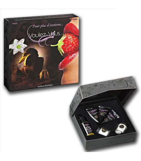 Ce Coffret de Massage Exotique signé Voulez-Vous... inclus 6 produits de massage pour plus d'exotisme ! C'est le coffret cadeau idéal pour jouer avec vos sens et ceux de votre partenaire. Cette boîte contient l'essentiel pour atteindre les hauteurs de l'érotisme ! La marque Voulez-Vous... propose 13 parfums très originaux. Le Coffret de Massage Exotique contient : * 3 Berlingots d'huiles corporelles chauffantes "Huile de la tentation", ces berlingots (10 ml) se dégustent tendrement sur le corps de votre partenaire. Si vous soufflez délicatement dessus, une douce sensation de chaleur va s'emparer des zones effleurées. Parfums : Vanille, Fruits Rouges et Noix de Coco. * 2 Poudres gourmandes "Chute de neige", ces poudres (4 g) sont à saupoudrer délicatement sur le corps de votre partenaire pour qu'une sensation de gourmandise vous envahisse lorsque vous léchez sa peau ! Parfums : Fruits Rouges et Noix de Coco. * 1 Huile de Massage "Passage sous tes reins" Désir, cette huile de massage (25 ml) stimulera le plaisir. Parfum : Vanille. Les produits Voulez-Vous... sont 100 % Made in France et sans parabène. Vendu dans sa superbe boîte chic ce Coffret de Massage Exotique est le cadeau romantique idéal. Attention certains goûts de produit dans les coffrets peuvent être exceptionnellement modifiés en cas de rupture de stock. ...