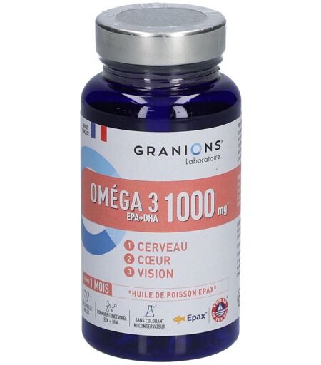 Complément alimentaire à utiliser dans le cadre d’une alimentation variée, équilibrée et d’un mode de vie sain.Granions Omega 3 1000 mg est un complément alimentaire conçu pour soutenir la santé cardiovasculaire, le fonctionnement du cerveau et le maintien d’une vision normale. Grâce à une haute concentration en acides gras essentiels EPA et DHA, ce produit est idéal pour ceux qui souhaitent bénéficier des bienfaits prouvés des Oméga-3 tout en respectant l’environnement. Certifié EPAX® et Friend of the Sea®, il garantit une pêche durable et responsable, contribuant ainsi à la protection des écosystèmes marins.IngrédientsHuile de POISSON, gélatine (POISSON), humectant : glycérol, vitamine E (huile végétale SOJA ou tournesol).Allergènes : Poisson, Soja.Valeurs nutritionnellesActifsTeneurAR*Huile de poisson1000 mg/Oméga 3800 mg/Dont EPA400 mg/Dont DHA300 mg/Vitamine E12 mg100%Conseils d'utilisationPrendre 1 à 2 capsules par jour avec un grand verre d’eau.Précautions d'emploiLes compléments alimentaires doivent être utilisés dans le cadre d'un mode de vie sain et ne pas être utilisés comme substituts d'un régime alimentaire varié et équilibré. Ne pas dépasser la dose journalière recommandée. Tenir hors de la portée des jeunes enfants. Les femmes enceintes et allaitantes sont invitées à prendre l’attache d’un professionnel de santé avant toute supplémentationPoids net60 capsulesAdresse du FabricantLABORATOIRE DES GRANIONS 5, allée Crovetto Frères, Le Parador II 98000 MONACO ...