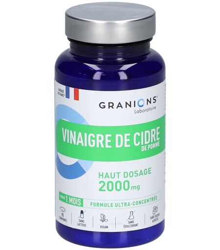 Complément alimentaire à utiliser dans le cadre d’une alimentation variée, équilibrée et d’un mode de vie sain.Le Vinaigre de Cidre de Pomme 2000 mg du Laboratoire Granions est un complément alimentaire naturel, reconnu pour ses vertus digestives et métaboliques depuis des siècles. Sa formule hautement dosée en poudre de vinaigre de cidre apporte un concentré d’enzymes, de minéraux et d’acides organiques pour soutenir la digestion, améliorer l’équilibre intestinal et favoriser la régulation de l’appétit et de la glycémie. Fabriqué en France, il est conçu pour offrir une alternative pratique aux vinaigres liquides, avec une assimilation optimale et sans désagrément lié à l’acidité.Les bienfaits du Granions Vinaigre de Cidre 2000 mgFacilite la digestion et réduit les ballonnements : Le vinaigre de cidre favorise la production d’enzymes digestives, ce qui facilite l’absorption des nutriments et réduit les sensations de lourdeur après les repas.Équilibre le microbiote intestinal : Grâce à ses propriétés probiotiques naturelles, il soutient une flore intestinale saine et limite les déséquilibres digestifs.Aide à la régulation de la glycémie : Contribue à stabiliser le taux de sucre dans le sang, évitant ainsi les variations glycémiques et les coups de fatigue post-repas.Régule l’appétit et favorise un métabolisme sain : Un soutien naturel pour ceux qui souhaitent mieux gérer leur alimentation et éviter les fringales intempestives.BénéficesSans lactoseSans glutenVeganSans édulcorantsSans sucres ajoutésIngrédientsPoudre de vinaigre de cidre de pomme, agents de charge : cellulose microcristalline – gomme d’acacia, lubrifiant : sels de magnésium d’acides gras, anti-agglomérant : phosphate tricalcique.Valeurs nutritionnellesActifTeneurPoudre de vinaigre de cidre de pomme2000 mgConseils d'utilisationPrendre 3 comprimés par jour, à répartir aux trois repas principaux (matin, midi et soir) ou lors des collations.Précautions d'emploiNe pas dépasser la dose journalière recommandée. Ne convient pas aux enfants de moins de 6 ans. Déconseillé aux femmes enceintes et allaitantes sans avis médical. En cas de troubles digestifs sensibles (ulcères, reflux sévères), commencer par une faible dose et consulter un professionnel de santé si besoin.Poids net90 comprimésAdresse du FabricantEquilibre Attitude1198 av du Docteur Maurine Donat06250 MouginsFrance ...