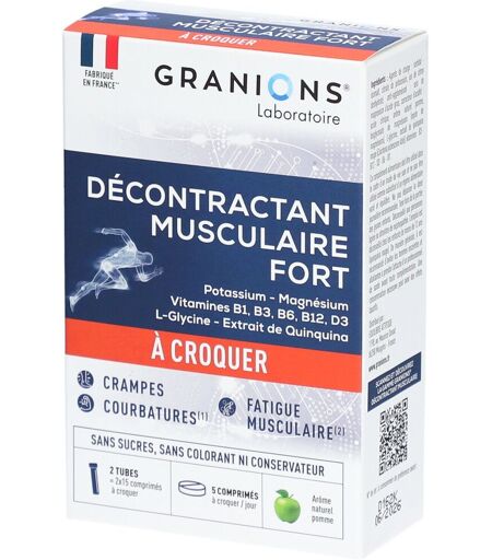 Complément alimentaire à utiliser dans le cadre d’une alimentation variée, équilibrée et d’un mode de vie sain.Granions Relaxant Musculaire Comprimés à Mâcher est un complément alimentaire conçu pour répondre aux besoins des sportifs et personnes actives. Ces comprimés à mâcher au goût pomme naturelle soutiennent la fonction musculaire et aident à réduire les crampes, douleurs et la sensation de fatigue. Le magnésium et le potassium contribuent au bon fonctionnement musculaire. Les vitamines B3, B6, B12 et le magnésium aident à réduire la fatigue.Sans colorants, sans conservateurs, sans lactose, sans sucre.Fabriqué en France.IngrédientsSorbitol, isomalt, citrate de potassium, jus de citron déshydraté, sels de magnésium d’acides gras, acide citrique, arôme naturel de pomme, bisglycinate de magnésium (oxyde de magnésium), L-glycine, extrait de quinquina (Cinchona pubescens Vahl), vitamines B3, B12, D3, B6, B1.Valeurs nutritionnelles Pour 5 comprimésAJR* Potassium300 mg15 % Magnésium56,25 mg15 % Vitamine B11,1 mg100 % Vitamine B316 mg100 % Vitamine B61,4 mg100 % Vitamine B122,5 µg100 % Vitamine D35 µg100 % L-Glycine250 mg- Extrait de quinquina150 mg- Conseils d'utilisationPour les sportifs :La veille de l’épreuve : 5 comprimés à répartir dans la journée.Le jour de l’épreuve : 1 comprimé avant l’effort, 1 par heure pendant l’effort, 1 après puis toutes les heures jusqu’à amélioration.Le lendemain : 5 comprimés répartis dans la journée.Pour les autres : 5 comprimés à mâcher par jour.Précautions d'emploiNe pas dépasser la dose journalière recommandée. Réservé à l’adulte. Déconseillé aux enfants de moins de 12 ans (présence de quinquina). Déconseillé aux personnes âgées ou atteintes de troubles rénaux. Les femmes enceintes ou allaitantes doivent consulter un professionnel de santé. Une consommation excessive peut avoir des effets laxatifs. À conserver dans un endroit frais, sec et à l’abri de la lumière. Tenir hors de portée des jeunes enfants. Ce complément alimentaire ne remplace pas une alimentation variée et équilibrée ni un mode de vie sain.Poids net30 comprimés = 36 gAdresse du FabricantLaboratoire des Granions7 rue de l'Industrie98000 Monaco ...
