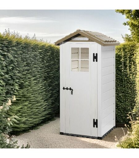 L'abri de jardin EVO 80 est une solution compacte et durable pour le rangement de vos outils et accessoires d’extérieur. Conçu en résine avec un toit ABS traité anti-UV, il résiste aux intempéries et ne nécessite aucun entretien. Facile à monter, il est livré avec un plancher composite épais qui permet une installation sans dalle béton. Capacité de stockage : 0,93 m² Matière : structure en résine, toit ABS traité anti-UV Épaisseur de la structure : 20 mm Surface utile intérieure : 0,58 m² Dimensions hors tout : 96,5 x 96,5 x 203 cm Hauteur du faîtage : 2,03 m Hauteur des parois : 1,77 m Dimensions extérieures au sol : 82,5 x 82,5 cm Dimensions intérieures utiles : 76 x 76 cm Plancher : dalle composite épaisseur 4 cm, isolant contre l’humidité et les fortes pluies Porte simple avec vitrage PVC : 59,2 x 173 cm Coloris : murs beige, toit marron Résistant aux moisissures, aux insectes et à la corrosion Visserie galvanisée fournie Condamnable par un cadenas (non fourni) Produit fabriqué en ...