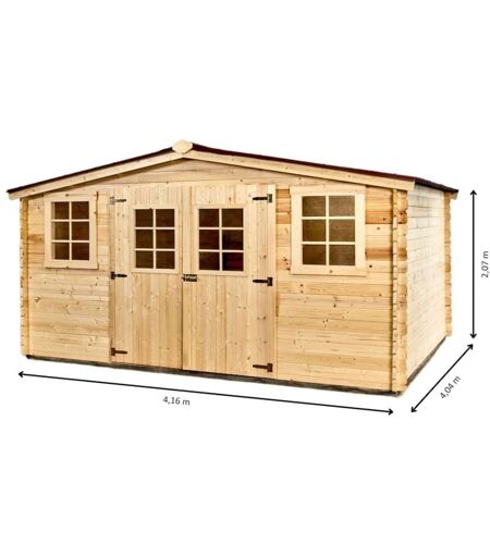Avec sa large façade de 4 mètres et ses deux fenêtres fixes, cet abri Baron en épicéa massif allie esthétique et fonctionnalité. Construit en madriers de 28 mm, il assure une excellente robustesse et une bonne isolation. Son toit en plaques ondulées bitumées rouges offre une protection optimale contre les intempéries, tandis que sa porte double avec lucarne et fenêtres vitrées garantit un intérieur lumineux et pratique. Dimensions hors tout : 4,16 x 4,04 m (16,81 m² - surface du toit) Dimensions intérieures : 3,80 x 3,80 m (14,44 m²) Dimensions au sol : 4,00 x 4,00 m (16 m²) Soubassement : 3,85 x 3,85 m (14,82 m²) pour installation sur dalle béton Hauteur : 2,07 m au faîtage / 1,71 m pour les parois Avancée de toit : 70 mm à l'avant et à l’arrière Porte double avec lucarne : 1,60 x 1,69 m, vitrage H 47,5 x L 46 cm Deux fenêtres fixes en façade : H 77 x L 64 cm, vitrage H 59 x L 48 cm Matériau : épicéa massif non traité Parois en madriers de 28 mm avec rainure et languette, coupe ...