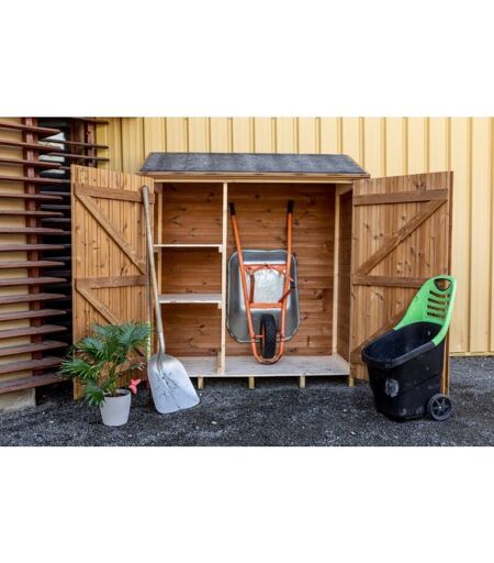 Habrita Foresta - Abri mural multi-usages bois thermo chauffé 1,05m2 2 étagères avec plancher double porte pleine Les avantages de cet abri mural THE 1708.01 Habrita Foresta sont : Plus résistant et durable. Procédé de traitement 100% naturel dans un four à 215°C. Une plus grande stabilité dimensionnelle des pièces de bois. Respect de l'environnement Très faible entretien Très facile à monter grâce au système en panneaux et au faîtage pré-assemblés Livré d'origine avec son plancher et 2 étagères Garantie 10 ans contre l'attaque d'insectes et pourrissement Conseils / Mise en service : A installer sur une dalle béton Usage domestique, rangement produits non dangereux Appliquer un saturateur ou une huile de bardage pour préserver le bois Caractéristiques techniques : Matière : Epicéa traité très haute température à 215°C sans aucun ajout de produit de synthèse. Epicéa massif traité classe II pour la structure des panneaux et la charpente Parois : Panneaux pré-montés de planches rabotées ...