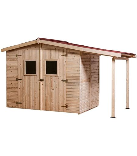 Description générale Abri en panneaux de 16 mm avec plancher et bûcher fabriqués en épicéa massif, idéal pour le rangement de matériel de jardin et le stockage de bûches ou de vélos. Le bois est non traité, il est conseillé de le lasurer après installation pour assurer sa longévité. Le toit est couvert de plaques ondulées bitumées, ce qui renforce la durabilité de l'abri. Livré avec un plancher, cet abri doit être installé sur une dalle en béton pour une meilleure stabilité. Spécifications techniques Dimensions extérieures au sol abri : 2,40 x 1,60 m Dimensions extérieures bûcher : 0,96 x 1,60 m Dimensions hors tout abri : 2,70 x 1,87 m Dimensions hors tout bûcher : 1,11 x 1,87 m Surface utile intérieure abri : 3,70 m² Surface couverte bûcher : 2,08 m² Hauteur mur : 1,74 m Hauteur faîtage : 2,10 m Porte double avec lucarnes : 1,60 x 1,74 m Matière : épicéa massif non traité Couverture : plaques ondulées bitumées Produit certifié FSC Garantie : 2 ans Compatibilité et accessoires À ...