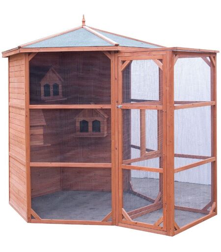 Grande volière pour 6 à 10 oiseaux, composée d'un sas d'entrée et d'un enclos grillagé. CARACTERISTIQUES TECHNIQUES Capacité : 6-10 oiseaux Matière : Bois Essence principale : Sapin Couleur du revêtement: Naturel Epaisseur des parois : 10 mm Surface extérieure hors tout : 4,5 m2 Dimensions hors-tout (cm): Hexagone 235 x 235 + SAS entrée 98 x 65 Dimensions au sol (cm): Hexagone 200 x 200 + SAS entrée 98 x 65 Hauteur faîtage : 238 cm Assemblage : Vis Couverture: Toit bitumé Grillage: Galvanisé Maillage du grillage (cm): 1 x 1 Produit certifié FSC 100% / n° de Chaîne de contrôle : FCBA-COC-000353 Dimensions de l'emballage 4 colis (cm) : 1 colis 201 x 103 x 19,5 + 1 colis 107 x 73 x 12,5 + 1 colis 106 x 115 x 18,50 + 1 colis 201 x 102 x 10,50 Poids 4 colis (kg): 1 colis Brut 36/ Net 34 + 1 colis Brut 12 / Net 10 + 1 colis Brut 26 / Net 24 + 1 colis Brut 27 / Net 25 Garantie 1 an ...
