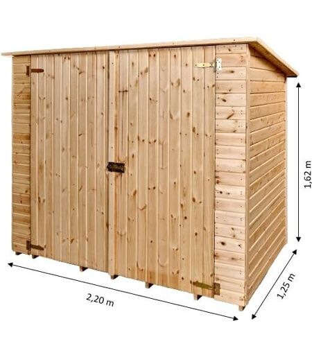 Description générale Cet abri mural en bois est idéal pour le rangement de vélos, scooters et motos. Conçu en épicéa massif, il offre une excellente résistance grâce à son toit en feutre bitumé et ses panneaux pré-montés. Avec sa couleur bois naturel, cet abri s'intègre harmonieusement dans votre jardin. Livré brut, il est recommandé de le lasurer après montage pour prolonger sa durabilité. Spécifications techniques Matière : épicéa massif non traité Dimensions hors tout : 2,20 x 1,25 m Dimensions au sol : 2,00 x 1,20 m Hauteur faîtage : 1,62 m Hauteur des parois : 1,43 m Porte double : 1,58 x 1,59 m avec loquet pour cadenas Surface utile intérieure : 2,37 m² Parois : panneaux pré-montés en sapin d'épaisseur 16 mm Plancher : panneaux de particules traités d'épaisseur 12 mm Couverture : feutre bitumé de couleur foncée Certifié PEFC Garantie : 2 ans Fabriqué en Europe Compatibilité et accessoires À installer sur une dalle pour assurer la stabilité Possibilité d'utiliser un kit de ...
