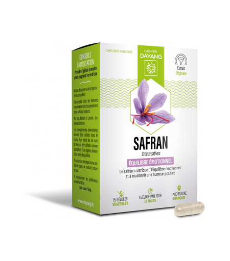 Parmi les plantes qui agissent sur l'équilibre émotionnel, il existe le safran. Le safran contribue à l'équilibre émotionnel. Il aide à favoriser la relaxation et à maintenir une humeur positive. Le safran est originaire du Moyen-Orient et de l'Orient. Il s'agit d'une plante vivace à fleurs mauves somposées de 3 stigmates rouges. Le safran Dayang se présente sous forme d'un extrait sec qui concentre les principes actifs de la plante afin de permettre le confort d'une utilisation réduite à une gélule par jour. Il est titré à 2% en safranal soit 0,6 mg. Conditionné en France. La protection individuelle sous blister de chaque gélule assure une conservation idéale. ...
