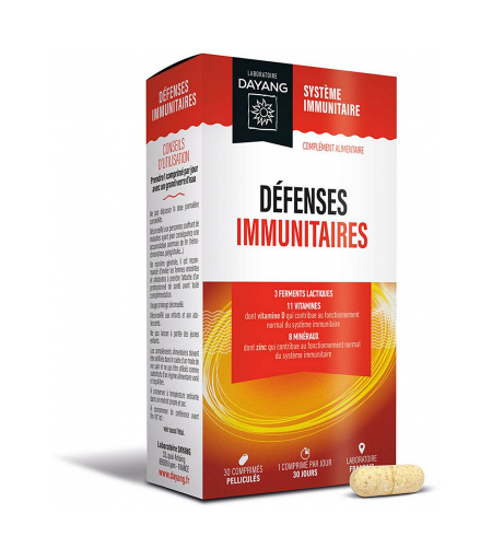 Le produit Défenses immunitaires DAYANG est composé de ferments lactiques, vitamines et minéraux. La vitamine D et le zinc contribuent au fonctionnement normal du système immunitaire. Laboratoire français. La protection individuelle sous blister de chaque comprimés assure une conservation idéale. ...