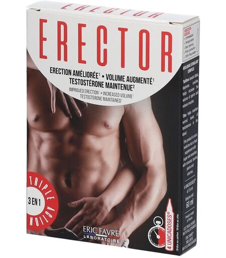 Complément alimentaire à utiliser dans le cadre d'une alimentation variée, équilibrée et d'un mode de vie sain.Améliorez vos performances sexuelles avec Erector, une formule complète à base d’extraits de plantes, vitamines, minéraux et taurine.Le safran stimule la libido, améliore l’érection, contribue à l’augmentation du volume du sperme et relaxe les muscles. Le zinc contribue au maintien d’un taux normal de testostérone dans le sang.Le magnésium, la vitamine B5 et C contribuent à réduire la fatigue.IngrédientsEAU, FRUCTOSE, MINERAUX : CITRATE DE MAGNESIUM, SULFATE DE ZINC, TAURINE, ACIDIFIANT : ACIDE CITRIQUE, SATIERAL® : EXTRAIT DE SAFRAN (1.12%), VITAMINES : C, E, B3, B5, B1, EXTRAIT DE MUIRA PUAMA (0.84%), EXTRAIT DE FENUGREC (0.5%), CONSERVATEURS : SORBATE DE POTASSIUM, BENZOATE DE SODIUM, AROME NATUREL DE CARAMEL AVEC D’AUTRES INGREDIENTS NATURELS, EDULCORANT : SUCRALOSE.Données nutritionnelles Pour 1 dose de 15 mlTaurine : 300 mgSatiereal, extrait de safran : 168 mgExtrait de muira puama : 126 mgExtrait de fenugrec : 75 mgMagnésium : 56,25 mg (15% AR)Zinc : 10 mg (100% AR)Vitamine C : 80 mg (100% AR)Vitamine B3 : 16 mg (100% AR)Vitamine E : 12 mg (100% AR)Vitamine B5 : 6 mg (100% AR)Vitamine B1 : 1,1 mg (100% AR)AR* = Apports de référence.Conseils d'utilisationsPrendre une dose 30 minutes avant l’acte sexuel.Précautions d'emploiCe produit n’est pas un médicament mais un complément alimentaire avec sucres et édulcorant, à base de minéraux, taurine, plantes et vitamines.Se conformer aux conseils d’utilisation. Tenir hors de portée des jeunes enfants. A utiliser dans le cadre d’une alimentation diversifiée et d’un mode de vie sain. Ne pas utiliser chez la femme enceinte et allaitante.Poids net4 unicadoses de 15 mlFabricantLes trois chênes69770 Villecheneve ...