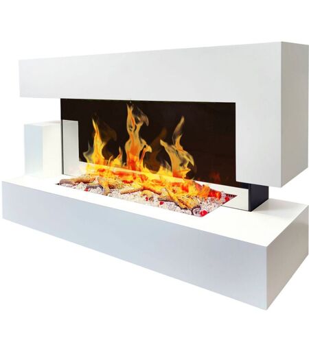 La cheminée électrique murale Quartz 120 cm apporte une touche moderne et raffinée à votre intérieur grâce à son design épuré et rectiligne, sa façade blanche élégante, et son rétroéclairage des accessoires décoratifs (bûches et cristaux). Compacte et décorative, elle crée une ambiance chaleureuse et contemporaine, idéale pour un salon, une chambre, un bureau ou même un appartement. Les spots d’éclairage latéraux et l’effet flammes LED ultra réaliste diffusent une lumière douce et apaisante, visible en façade et sur les côtés pour un rendu unique. 100 % électrique, elle ne nécessite aucun conduit, ne dégage ni fumée, ni cendre, ni CO₂, et fonctionne sans bruit, pour un usage simple, propre et sécurisé. Le mode flammes seul ne consomme que 10W, ce qui permet de profiter de l’ambiance cheminée tout au long de l’année, sans surconsommer. Le chauffage 2000W intégré, avec thermostat réglable, chauffe rapidement jusqu’à 30 m² lorsque vous en avez besoin. Tous les paramètres (intensité et ...