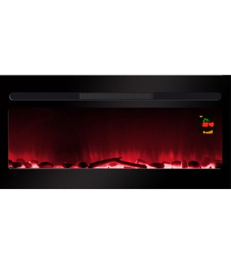 Effet flamme ultra réaliste (technologie leds Chemin'Arte) qui reproduit l'ambiance d'une véritable cheminée Aucun entretien, pas de fumée, pas d'odeur, pas de poussière, ni de conduit necessaire Leds à changement de couleurs: JAUNE/ROUGE/BLEU Ecran LCD de réglage de la température (thermostat électronique). L'écran s'éteint après réglage Les couleurs défilent en appuyant sur le bouton de la télécommande Chauffe une pièce d'environ 30m² Mode économie d'énergie qui ne consomme que 15W (seulement les flammes) Télécommande de réglage à distance Timer 8h Intensité des flammes réglables Design moderne et épuré La façade en verre trempé reste parfaitement froide (pas de risque de brûlures) Se fixe au mur ou s'encastre à l'aide des accessoires livrés Installation rapide et aisée (15 minutes environ) Livré avec des galets décoratifs Possibilité d'intégrer des accessoires des décoration (buches, cristaux rouges,?). Vendus en option Puissance de chauffe 2000W par ventilo convection 2 modes de ...
