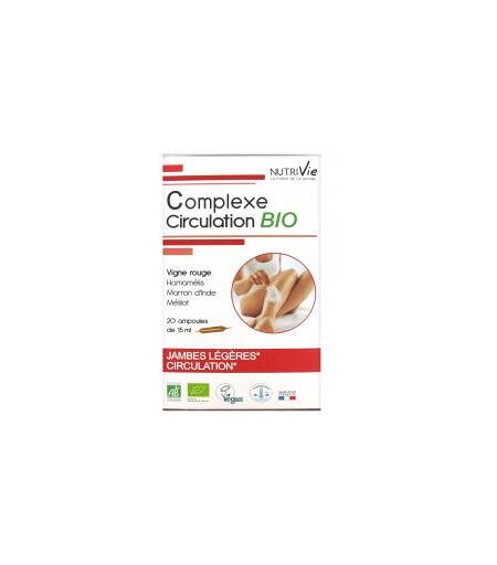 Ampoules - complexe circulation BIO jambes légères* / circulation*. La sensation de lourdeur des jambes est souvent liée à une mauvaise circulation du sang. Le complexe circulation BIO Nutrivie, composé de vigne rouge, d'hamamélis, de marron d'inde ...