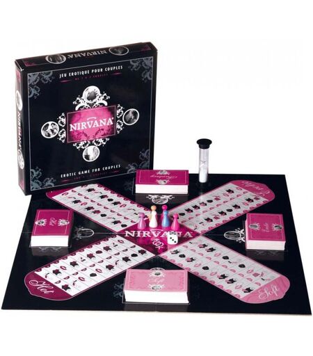 Je suis le Jeu de société Nirvana, dans le langage familier, nirvana désigne un "bonheur suprême", un plaisir des sens atteint notamment par la sexualité, des objets ou des situations hautement agréables. Synonyme de plaisir intense, Je peux être joué à 2 comme à 6 joueurs, sans distinction de sexe et jusqu'à 3 couples peuvent se retrouver autour de moi. Je suis un jeu de société pour adultes qui s’adresse aux couples coquins en quête de nouvelles sensations. Basé sur la découverte de soi et des autres, chaque joueurs a la possibilité de donner des gages en fonction de l’ambiance de la soirée. Elle peut être détendue mais aussi coquine et excitante. Les 4 zones du jeu et les cartes adaptées à ces zones permettent de faire monter l’excitation tout au long de la partie. Le concept du jeu permet également l'utilisation d’accessoires : menottes, masques, sextoys, huiles parfumées... Laissez vous porter par les 208 cartes me composant et découvrez les envies des autres participants tout au long de la partie, tout en dévoilant vos préférences, vos fantasmes et vos petits secrets aux autres joueurs. La progression dans le jeu permet de créer une ambiance adaptée à tous. 4 zones réparties sur mon plateau (Soft, Érotique, Coquine et Hot) vous donneront l'opportunité de faire évoluer vos envies, mais aussi de repousser vos limites... sans aucune obligation. 80 cases de gages sont là pour faire monter l'excitation tout au long de la partie. Mon design sobre et chic vous séduira et ma petite taille me rend facilement transportable ! Durée moyenne d'une partie : 1 à 3 heures, selon les envies et l'excitation... Je contiens : 1 plateau de jeu (40 cm x 40 cm), 208 cartes de gages (Soft, Érotique, Coquine et Hot), 6 pions, 1 dé, 1 sablier de 30 secondes. ...