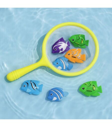 SHOP-STORY Jeu de Pêche pour Enfants avec Épuisette et 6 Poissons Colorés Idéal pour le Bain la Piscine ou les Jeux d'Eau en Extérieur
