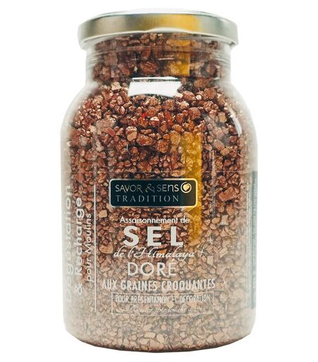 Faites briller vos repas de fête de mille feux ! Contient du sel rose de l'Himalaya extrait à la main Graines de sésame blanc et de moutarde blonde Couleur or festive et originale pour vos plats Pot de 650g - Couvercle à visser Compatible moulin à sel doré Savor&Sens ...