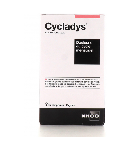La période avant et pendant les règles peut être un passage difficile, pouvant réduire sensiblement la qualité de vie des femmes. Cela s’exprime différemment d’un cycle à l’autre : douleurs, sautes d’humeur, gênes digestives, sensation de gonflement, etc.La formule de Cycladys® associe 2 complexes complets et innovants pour des actions complémentaires.- Endo-NP est composé de PEA* associé à du gattilier qui favorise le confort menstruel, de l’achillée qui apaise les crampes abdominales et de l’alchémille qui aide à réguler les cycles. De plus, le fenouil favorise le confort digestif et l’élimination rénale de l’eau.- L-Neurocalm combine 3 acides aminés dont le L-Tryptophane, précurseur de la sérotonine, à de la mélisse qui favorise la détente et la bonne humeur. Le Magnésium et la vitamine B6 aident à réduire la fatigue et favorisent un état nerveux normal.Pionniers de l’Aminoscience®, la science des acides aminés, les Laboratoires NHCO Nutrition® développent des formules innovantes de qualité, en réponse à des besoins nutritionnels ciblés, afin que chacun devienne acteur de sa santé. ...