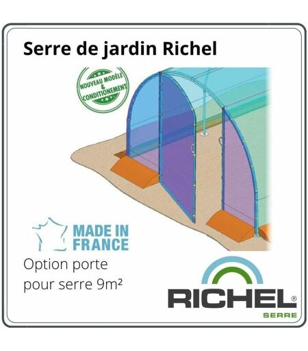 Option pour serre de 9m² qui permet d'équiper une serre Richel d'une deuxième porte. Caractéristiques techniques : Armature en acier galvanisé avec des arceaux en tube de diamètre 32 mm et d'épaisseur 1,5mm Tension et maintien du film en pignon par système de clips Large porte cintrée en partie haute pour une ventilation à la fois simple et optimale Montage facile, par vissage et boitement, sans outillage spécifique Notice de montage claire et illustrée ...