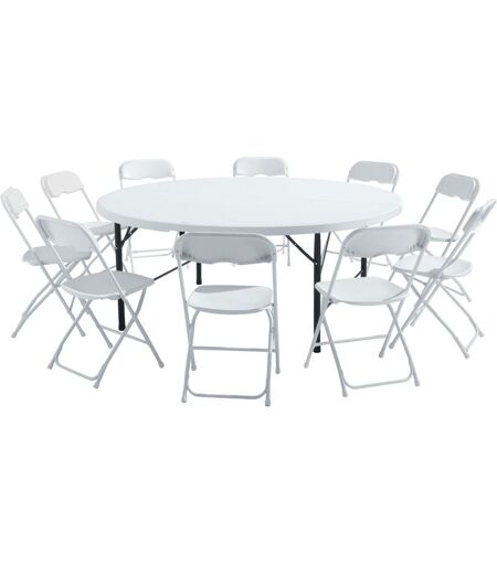 Table pliante ronde diamètre 180 cm et 10 chaises pliantes - Cet ensemble table et chaises pliantes 10 places est idéal pour tout événement professionnel ou en salon de jardin d'appoint pour vos réceptions. Cet ensemble table pliante et chaises de réception dispose d'une structure en acier et d'un plateau en résine plastique. Vous pourrez donc utiliser votre salon en extérieur comme en intérieur. La table ronde est pliante et se transforme en format valise. Une fois repliée vous pourrez la ranger et la transporter facilement grâce à sa poignée. Dimensions ouvert Table: diam.180 x H.76 cm - Chaise: L.40 x l.45 x H.81 cm Dimensions fermé Table: L.180 x l.90 x ép.8 cm - Chaise: H.97 x l.40 x ép.3 cm Nombres de places assises 10 personnes Matière Structure: acier avec finition peinture époxy. Plateau et assise: Polyéthylène Haute Densité (PEHD) Section de la structure Table: Structure de section Diam. 28 mm x Ep. 1,2 mm - Chaise: Structure de section Diam. 19 mm Couleur Table: piétement ...