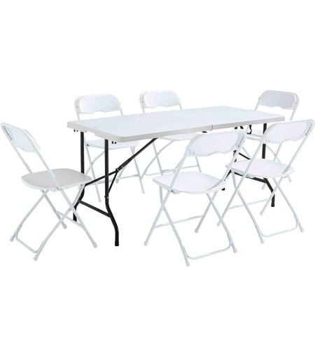 Ensemble Table et chaises pliantes 6 places 162 cm. Ce lot table de réception pliante et ses 6 chaises pliables est idéal en mobilier d'appoint. La table se plie en format valise et dispose d'une poignée de transport afin de l'emmener partout, camping, pique nique, réceptions... La table et les chaises de réception sont particulièrement solides avec une structure en acier finition époxy, un plateau et une assise en PEHD capable de supporter jusqu'à 130 kg pour la table d'appoint et 110 kg pour la chaise pliante. Dimensions ouvert Table: L.162 x l.71,5 x H.71 cm - Chaise: L.40 x l.45 x H.81 cm Dimensions fermé Table: L.81 x l.71,5 x ép.8 cm - Chaise: H.97 x l.40 x ép.3 cm Nombres de places assises 6 personnes Matière Structure: acier avec finition peinture époxy. Plateau et assise: Polyéthylène Haute Densité (PEHD) Section de la structure Table: Structure de section Diam. 28 mm x Ep. 1,2 mm - Chaise: Structure de section Diam. 19 mm Couleur Table: piétement noir et plateau blanc ...