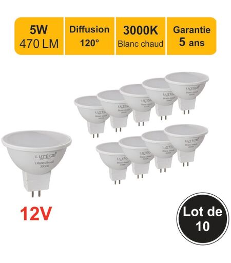 LUTECE-ARC Lot de 10 ampoules led GU5.3 (MR16) 12V 5W - 120° - 470Lm 3000K - garantie 5 ans