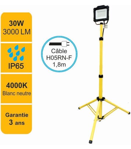 Lutece-arc - Projecteur led de chantier 30W 3000lm 4000K avec trépied ajustable - garantie 3 ans