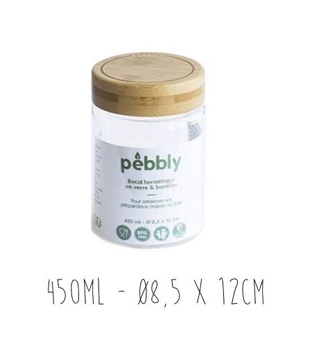 Adeptes du zéro déchet, ce bocal rond en verre Pebbly est pour vous ! Contenant en verre borosilicate sans BPA - Très solide Couvercle à vis en bambou - Hermétique et pratique Compatible four, micro-ondes et lave-vaisselle (sauf le couvercle) Disponible en 3 contenances : 450, 650 ou 850ml ...