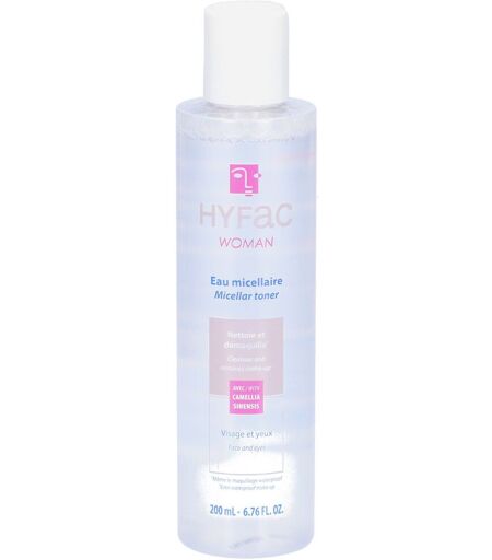 L’hygiène de la peau du visage est essentielle pour les peaux à imperfections. L’eau micellaire Hyfac Woman permet un nettoyage en douceur. Ses extraits de camelia sinensis réveillent l’éclat du teint. Avec ses discrètes petites notes florales, son utilisation matin et soir devient un pur rituel de bonheur.BénéficesEclaircit le teint grâce aux extraits de camelia sinensisNettoie et démaquille même le maquillage waterproofHypoallergénique, convient aux peaux sensiblesConseils d'utilisationAppliquer sur le visage et le cou à l’aide d’un coton. Ne se rince pas.CompositionAQUA (WATER), PROPANEDIOL, PEG-6 CAPRYLIC/CAPRIC GLYCERIDES, PEG-7 GLYCERYL COCOATE, CAPRYLYL/CAPRYL GLUCOSIDE, CAMELLIA SINENSIS LEAF EXTRACT, CODIUM TOMENTOSUM EXTRACT, BUTYLENE GLYCOL, HYDROXYETHYLCELLULOSE, TETRASODIUM GLUTAMATE DIACETATE, CITRIC ACID, PARFUM (FRAGRANCE), CETRIMONIUM BROMIDE.ConditionnementFlacon de 200 ml ...