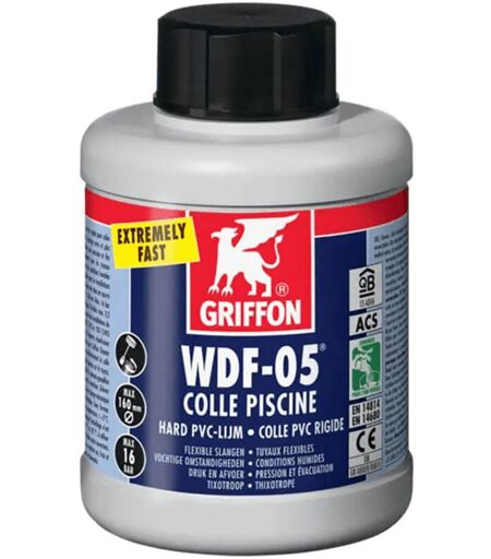 Colle PVC de marque Griffon - Bidon de 250 ml avec pinceau goupillon Cette colle PVC convient parfaitement pour coller les tuyaux, manchons et raccords à ajustage serré et plus large (garnit les joints) dans des installations sous pression et d'évacuation. Avec pinceau-goupillon spécial pour une utilisation rapide et facile. Convient pour des diamètres ? 160 mm. Max. 16 bar (PN 16). Tolérance maximale 0,8 mm jeu / 0,2 mm serrage (tuyaux flexibles max. 0,3 mm) / 0,2 mm serrage. Convient notamment pour toutes les installations conformément aux normes EN 1329, 1452, 1453, 1455 et ISO 15493 (PVC). Informations importantes : Ne pas utiliser à des températures ? +5 °C A prise très rapide Thixotrope Garnit les joints À conserver dans son emballage non ouvert entre +5°C et +25°C. À utiliser avant (MM/AA) : voir emballage. Bien refermer l'emballage après utilisation et conserver dans un endroit sec, frais et à l'abri du gel. +Colle PVC de marque Griffon - Bidon de 250 ml avec pinceau goupillon ...