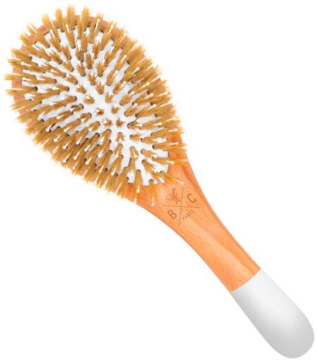 Les poils de sanglier combinés aux picots en nylon démêlent et lissent les cheveux. Grâce à leur souplesse, les picots en nylon démêlent en douceur et réduisent l'électricité statique des poils de sanglier. Les poils de sanglier scellent la couche d'écailles du cheveu et le rendent plus brillant. Les pointes sphériques, associées au coussinet en caoutchouc, protègent et massent délicatement le cuir chevelu. Convient à tous les types de cheveux. Manche très résistant en bois de hêtre. Utilisation : Nous vous recommandons de brosser vos cheveux au moins deux fois par jour afin de les démêler et de les lisser. Pour nettoyer votre brosse Bachca, enlevez tous les cheveux coincés entre les broches, puis utilisez une dose de shampooing doux, frottez doucement et rincez abondamment. Séchez votre brosse sur un chiffon propre, les broches vers le bas, pendant environ une journée. Ne l'utilisez pas sous l'eau et évitez tout contact prolongé avec l'eau. BACHCA, c'est l'amour des belles choses et le souci du détail. Nous créons de beaux objets, simples et délicats, indispensables à chaque femme. La beauté au quotidien à un prix raisonnable. ...