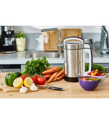 Préparez-vous de délicieuses soupes maison avec ce blender à soupe chauffant Cook & Heat grand format ! Réalisez de savoureuses préparations healthy à base de légumes frais. A vous les vitamines pour rester en pleine forme ! Utilisation rapide et simple avec ce blender à soupe ! Gagnez du temps en cuisine gràce à ses 4 programmes pré définis. Le blender Cook & Heat mixe et chauffe, deux fonctions parfaites pour réaliser des soupes veloutées ou moulinées, des compotes de fruits, des coulis ou encore des smoothies. Vous allez vous régaler ! Vous pouvez également mixer vos préparations selon vos envies en utilisant sont programme de mixage manuel. De plus, la lame en acier inoxydable est idéale pour réaliser un mixage parfait. Un blender à soupe puissant avec une grande capacité pour plaire à tous La grande capacité de 1.6L de ce mixeur à soupe est parfaite pour cuisiner pour toute la famille. Sa puissance est de 1150 W et sa puissance de chauffe de 950 W. Maintenez au chaud aux préparations Avec ce blender, vous réaliserez des préparations chaudes ou froides, selon vos envies. De plus, le bol en acier inoxydable permet de maintenir vos recettes au chaud ou au froid durant plusieurs heures. Un blender avec un contrôle intelligent Le blender possède un système de contrôle intelligent afin d'éviter les débordements. Auto mémoire Sa fonction d'auto mémoire, vous permettra d'ajouter les ingrédients que vous avez oubliées d'insérer dans votre recette. Et ce, même si le programme a déjà commencé. Rien de plus simple, pour cela, il vous suffira d'opter le couvercle, puis d'ajouter les ingrédients manquants et de remettre le couvercle. Ainsi, le programme reprendra là où il s'est stoppé. I Un blender à soupe auto nettoyant Sa fonction auto nettoyant sera parfaite pour laver votre blender chauffant en quelques secondes. ...