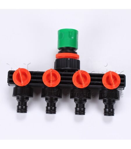SELECTEUR 4 VOIES RACCORD ADAPTATEUR GARDENA AUTOMATIQUE TUYAU D'ARROSAGE MALE POUR ROBINET Cet ensemble est composé d'un adaptateur gardena femelle et d'une sortie 4 voies avec vannette 1/4 tour séparée pour connecter directement vos tuyaux d'arrosage sur le même point d'eau. Il se place directement sur votre robinet d'arrivée d'eau grâce à l'embout femelle type "gardena". La sortie est alors transformée, en 2 sorties type"gardena" mâle et 2 sorties 20x27 mm. Les sorties sont équipées d'une vannette 1/4 tour ce qui vous permet de gérer votre zonage d'arrosage!!! Il vous suffit ensuite de venir enclicter directement votre tuyau d'arrosage sur les sorties "gardena" mâle et/ou de brancher vos système fixe sur les sorties filetées (ou de rajouter 2 nez de robinet sur ces dernières pour avoir 4 sorties arrosages mâles) et le tour est joué!! ...