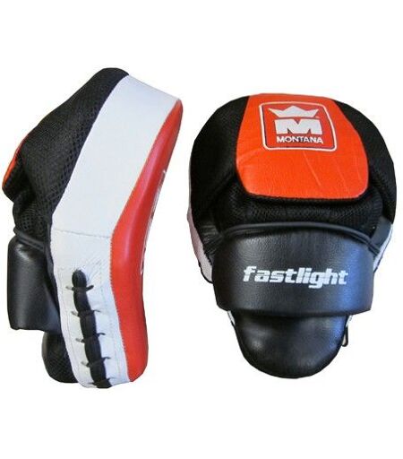 Pattes d'ours de boxe Montana Fastlight Pattes d'ours très légères (350 gr) avec prise en main facile et rapide. Courte incurvées, en cuir de Buffle. Mousse absorbante et bloc EVA haute densité. Système de prise optimisé grâce au 'Gripp' pour la paume de la main combiné au gant confort 'VENTIL'AIR' qui permet l'évacuation de la transpiration et la ventilation de la main. Protection du dessus de main, des doigts. Longueur : 26 cm. Homologation CE. Vendues par paire. ...