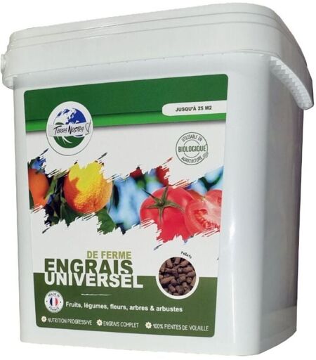 Boostez la vitalité de vos plantes et de votre jardin avec l' engrais universel de ferme Terra Nostra ! Sous forme de pellets pratiques, cet engrais naturel est élaboré en France à partir de matières premières de qualité, idéal pour enrichir tous types de sols et soutenir la croissance de vos cultures, légumes, fleurs, arbres fruitiers ou pelouse. ? Avantages & points forts Engrais universel : convient à tous les végétaux du jardin (potager, massifs, gazon, fruitiers, plantes en pot...) Formule 100% naturelle : respectueuse de l'environnement et sans composants chimiques de synthèse Sous forme de pellets : application facile, dosage précis, effet longue durée Fabriqué en France : circuit court et traçabilité garantie Améliore durablement la structure du sol : favorise l'activité microbienne et la fertilité Mode d'emploi Épandez les pellets sur la surface souhaitée (terre, compost, autour des plantations...) Griffez légèrement le sol pour les incorporer Arrosez pour activer la ...