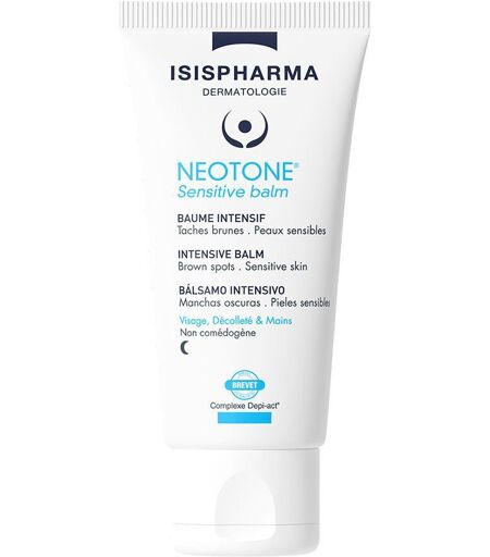 La crème de nuit Neotone Sensitive, conçue pour les peaux sensibles, réduit visiblement les taches brunes sur le visage et les mains grâce à son complexe breveté DEPI-ACT, une combinaison d'ingrédients actifs soigneusement sélectionnés pour leurs propriétés hydratantes et dépigmentantes.IndicationBaume intensifApplicationSur votre visage, votre décolleté et vos mainsUtilisez Neotone Sensitive tous les soirs sur les taches brunes visibles.IngrédientsAQUA (WATER), CAPRYLIC/CAPRIC TRIGLYCERIDE, BUTYLENE GLYCOL, BUTYROSPERMUM PARKII (SHEA) BUTTER, GLYCERIN, NIACINAMIDE, SORBITAN PALMITATE, SQUALANE, CETYL ALCOHOL, ISODECYL NEOPENTANOATE, DIMETHICONE, GLYCERYL STEARATE, PENTYLENE GLYCOL, SODIUM CETEARYL SULFATE, BENTONITE, AMMONIUM ACRYLOYLDIMETHYLTAURATE/ VP COPOLYMER, P-ANISIC ACID, PARFUM (FRAGRANCE), CHLORPHENESIN, DIMETHICONE/VINYL DIMETHICONE CROSSPOLYMER, SODIUM ACRYLATE/ SODIUM ACRYLOYLDIMETHYL TAURATE COPOLYMER, ISOHEXADECANE, CITRIC ACID, POLYSORBATE 80, SODIUM HYDROXIDE, ALARIA ESCULENTA EXTRACT, SORBITAN OLEATE, GLYCYRRHIZA GLABRA (LICORICE) ROOT EXTRACT, TRIMETHOXYBENZYL ACETYLSINAPATE, DIACETYL BOLDINE, UNDARIA PINNATIFIDA EXTRACT ...