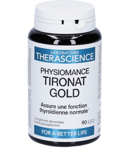 Complément alimentaire à utiliser dans le cadre d’une alimentation variée, équilibrée et d’un mode de vie sain.PHYSIOMANCE® Tironat Gold est une formule conçue et développée en partenariat avec le Professeur Anne-Marie ROUSSEL (Professeur émérite de biochimie nutritionnelle, Faculté de Pharmacie - Université Grenoble Alpes). PHYSIOMANCE® Tironat Gold a fait l'objet d'une recherche et d'un développement approfondis afin de créer une solution spécialement adaptée pour contribuer à la production normale d'hormones thyroïdiennes et au fonctionnement normal de la thyroïde.PHYSIOMANCE® Tironat Gold prévoit 3 comprimés:300 mg d'extrait d'Ashwagandha biologique**, KSM-66® titré à 15 mg de withanolides, qui contribue à l'équilibre émotionnel et au bien-être général. Il aide l'organisme à résister au stress et à l'anxiété et à maintenir l'équilibre mental et la stabilité émotionnelle ;500 mg d'extrait de Sophora Japonica avec 50 mg de kaemférol ;400 mg d'extrait de Commiphora mukul titré à 40 mg de guggulstérones, qui favorise un bon équilibre des hormones thyroïdiennes ;100% de l'AR* en iode, qui contribue à la production normale d'hormones thyroïdiennes, à une fonction thyroïdienne normale et à un métabolisme énergétique normal ;182% de l'AR* en sélénium, qui contribue à une fonction thyroïdienne normale et aide à protéger les cellules contre le stress oxydatif ;100% de l'AR* en zinc et 50% de l'AR* en vitamine E naturelle, qui contribuent à protéger les cellules contre le stress oxydatif ;50% de la AR* en vitamines B1, B2, B3, B5, B6, B8, B9 et B12. La vitamine B6 contribue à réguler l'activité hormonale.Les vitamines B1, B2, B3, B5, B6, B8 et B12 contribuent à un métabolisme énergétique normal. Les vitamines B2, B3, B5, B6, B9 et B12 contribuent à réduire la fatigue. La vitamine B2 contribue à protéger les cellules contre le stress oxydatif ;50% de la AR* en vitamine C, qui contribue à un métabolisme énergétique normal, réduit la fatigue et protège les cellules contre le stress oxydatif ;50% de la AR* en vitamine D3 naturelle.*Apports de référence**Dérivé de l'agriculture biologiquePourquoi choisir PHYSIOMANCE® Tironat Gold?Biodisponibilité optimale pour une efficacité garantieLe Laboratoire THERASCIENCE privilégie les principes actifs sous leurs formes les plus biodisponibles pour une meilleure absorption et assimilation par l'organisme. La biodisponibilité est la quantité d'une substance qui atteint la circulation sanguine ou le site d'action dans l'organisme après avoir été administrée ou consommée. En d'autres termes, il s'agit de la proportion d'une substance qui est effectivement absorbée et utilisée par l'organisme par rapport à la dose administrée. C'est pourquoi nous choisissons systématiquement des vitamines coenzymées, des minéraux sous forme de sels organiques, des extraits de plantes et des poudres titrées en molécules actives, des bio-actifs directement assimilables par les cellules.Une formule au naturel renforcéLes produits THERASCIENCE... ...