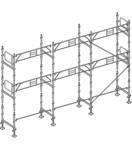 Échafaudage Façadier de 60 m². Cette gamme d'échafaudage galvanisé est adaptée aux travaux de peinture, ravalement, isolation,couverture, en neuf ou en rénovation. Apprécié pour sa rapidité au montage. Résistant, léger, longue durée de vie. Classe 4 (300 kg/m2). Montants des échelles diamètre 45 mm, épaisseur 2,2 mm. Largeur : 0.80 m Longueur de travail : 10 m Hauteur de travail : 6 m Fabrication française Nombre d'amarrages recommandés : 1 tous les 24 m² AG60 : Structure avec Garde-corps (sans plateau) Composition de l'échafaudage : - 8 vérins de niveau de 60 cm - 4 cadres de départ - 8 échelles de 2 m - 3 lisses de 3 m - 2 diagonales de 3 m x 2 m - 6 gardes corps standard de 3 m - 4 gardes corps d'extrémité standard ...